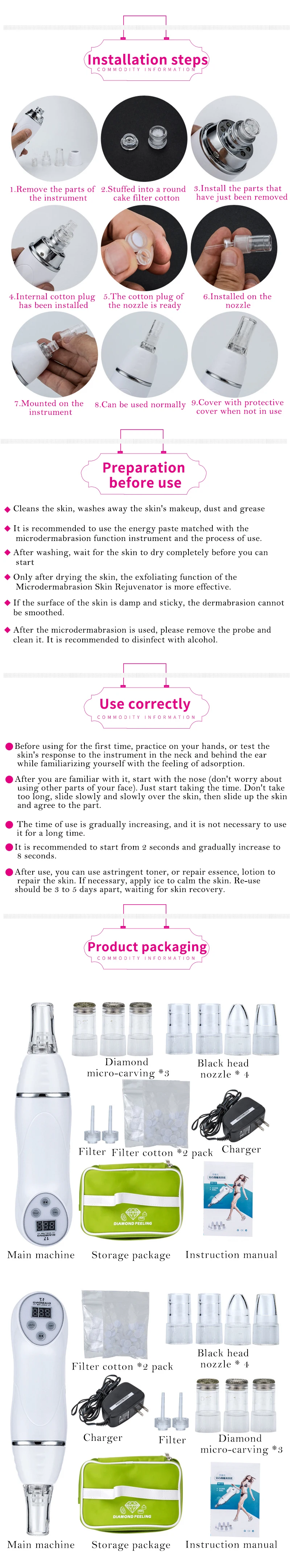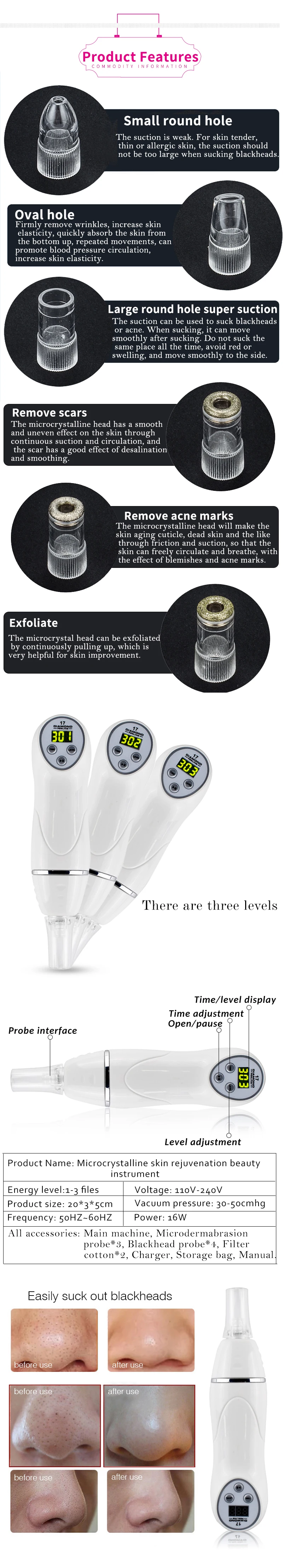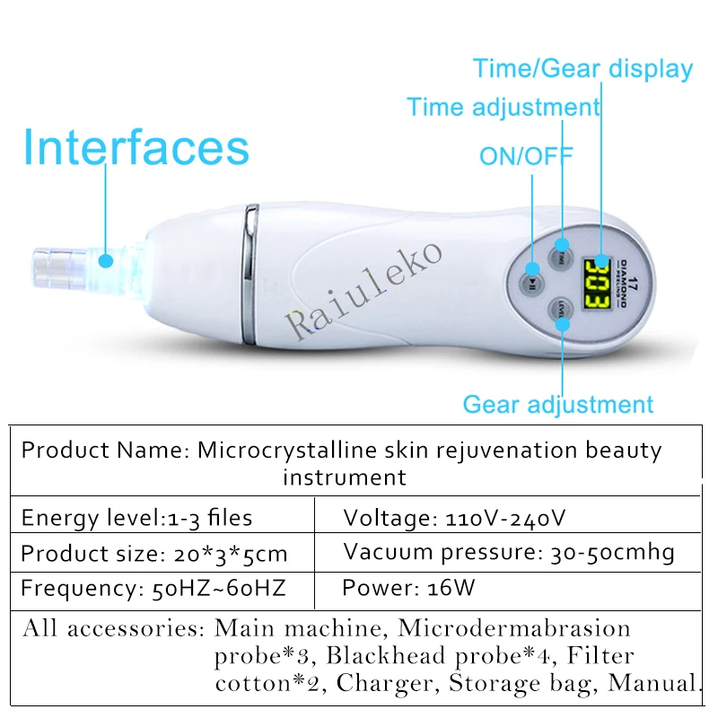 2.3 graus diferentes de espessura de cabeças de de dermoabrasão e 3 cabeças de tratamento a vácuo de tamanhos diferentes.